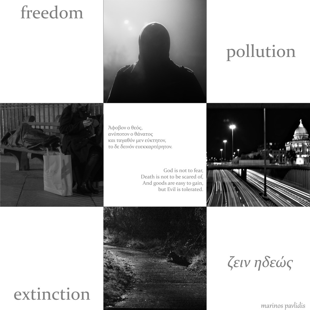 Αυτό το έργο είναι το δεύτερο στη σειρά δύο φωτογραφικών έργων που εργάστηκα κατά τη διάρκεια των σπουδών μου στο Πανεπιστήμιο Εφαρμοσμένων Επιστημών του Τάμπερε στη Φινλανδία. Κύριος σκοπός του είναι η αφύπνιση των ανθρώπων, σε μια προσπάθεια να τους κάνει να συνειδητοποιήσουν τι πάει στραβά στις κοινωνίες τους, προτείνοντας παράλληλα τον τρόπο ζωής του Επίκουρου ως βιώσιμη λύση.